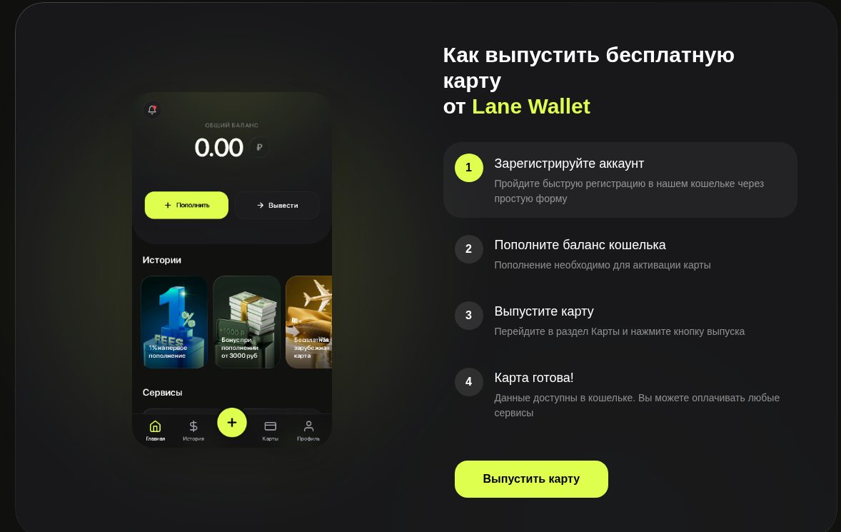 Основной продукт Lane Wallet — виртуальные карты Visa и Mastercard. Первая карта выпускается бесплатно, дополнительные тоже. Выпуск полностью автоматизирован — реквизиты появляются в личном кабинете сразу после оплаты. Разработчики указывают, что на картах включен полноценный 3D Secure — коды подтверждения для операций приходят прямо в интерфейс кошелька. СМС на телефон не нужен.