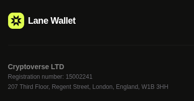 Кто стоит за Lane Wallet, неизвестно. В подвале сайта есть регистрационный номер 15002241 и название компании Cryptoverse LTD, но эта компания не работает с 2024 года. Единственный официальный канал связи с командой — Телеграм-бот поддержки @lanewalletsupportsbot. Для сервиса, который предлагает хранить и конвертировать деньги, отсутствие актуальной юридической информации — серьезная проблема. Прозрачности нет.