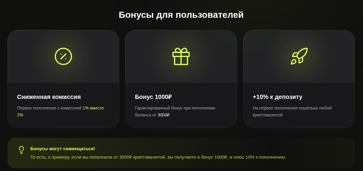 У проекта есть бонусная система. При пополнении кошелька от 3000 руб. начисляется 1000 рублей. Если пополнение сделано криптовалютой на ту же сумму, то добавляется еще 10% к пополнению. Разработчики указывают, что оба бонуса совмещаются.