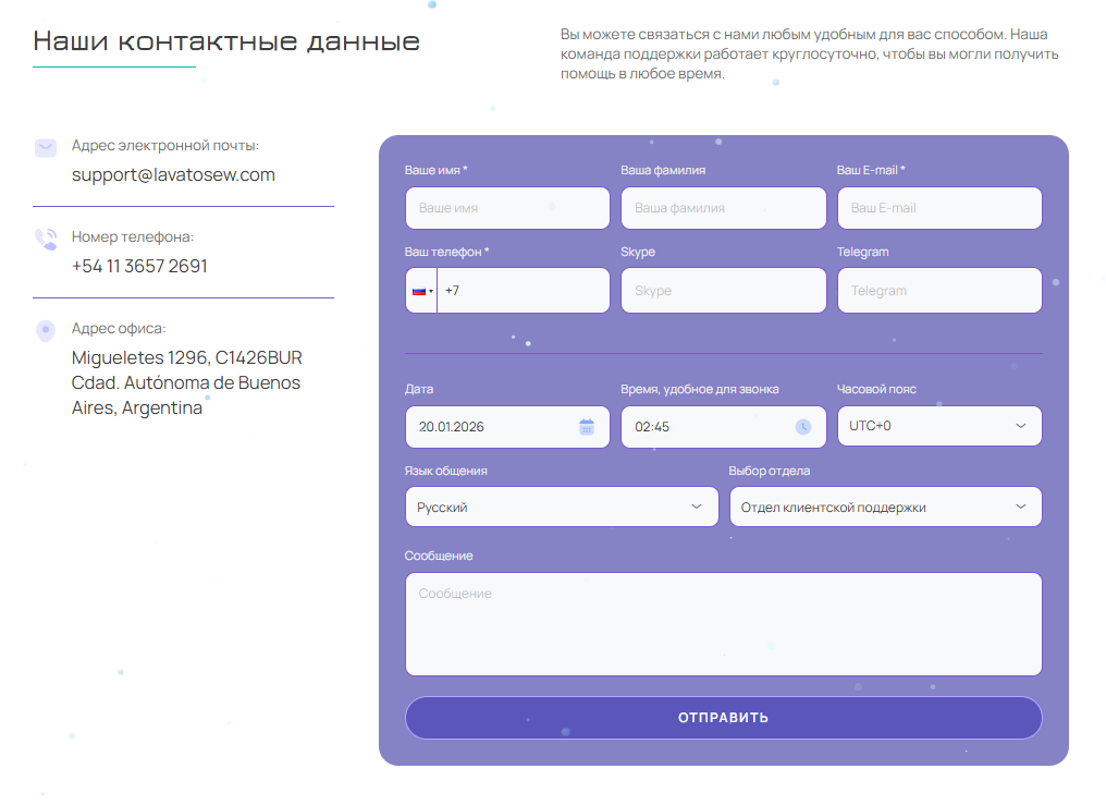 Основной адрес офиса находится в Аргентине. Номер телефона поддержки Lavatosew указан как +541136572691. Электронная почта для обращений обозначена support lavatosew com. Дополнительные способы связи через социальные сети или мессенджеры не представлены.