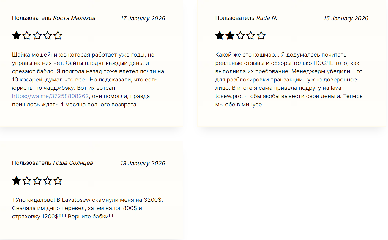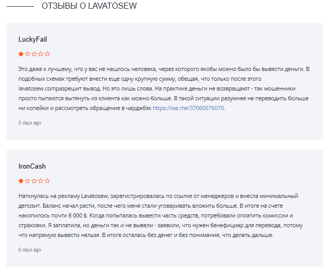 В интернете уже появились негативные отзывы о Lava tosew. Люди описывают ситуации, когда после внесения депозита баланс на платформе искусственно растет за счет успешных сделок. Затем при попытке вывода возникают требования дополнительных платежей. После выполнения этих требований поддержка выдвигает новые условия или прекращает общение.