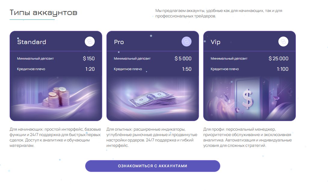 Доступ к платформе осуществляется после регистрации и верификации личного кабинета. Организация предлагает три типа торговых счетов: