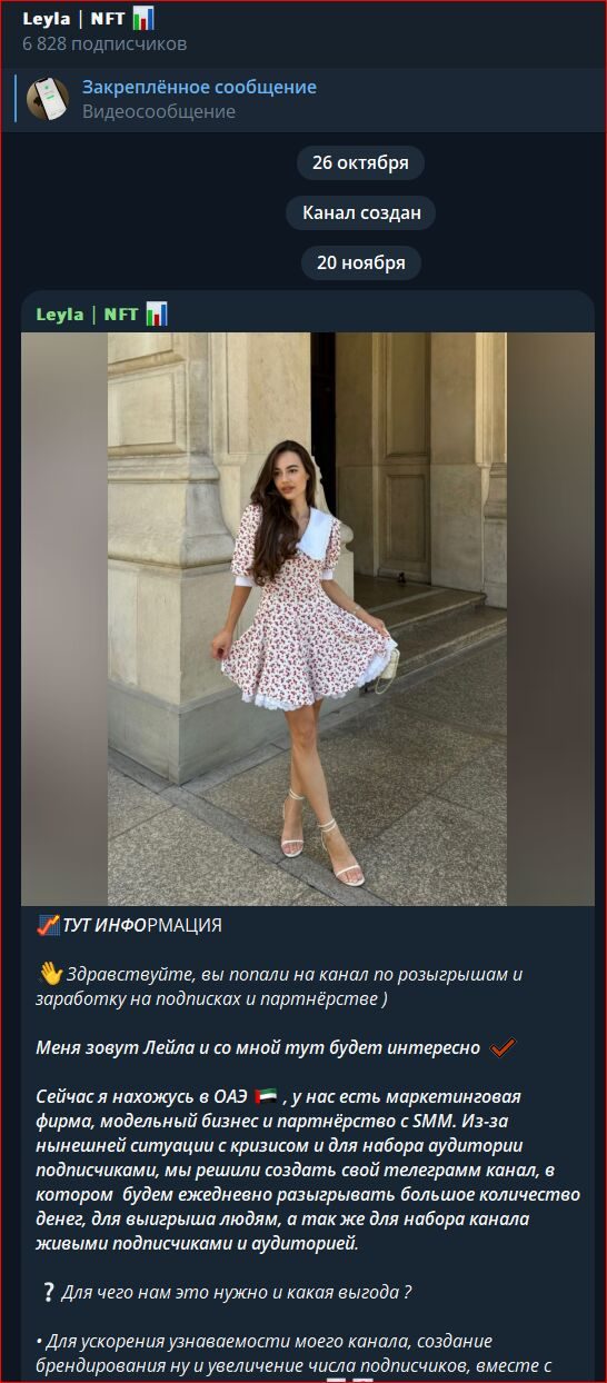 Телеграмм-канал «Лейла НФТ» был создан с единственной целью – проведением денежных розыгрышей. Все посты были посвящены этой теме, никаких обзоров рынка, аналитики, готовых сигналов и прочих полезных для торговли материалов.