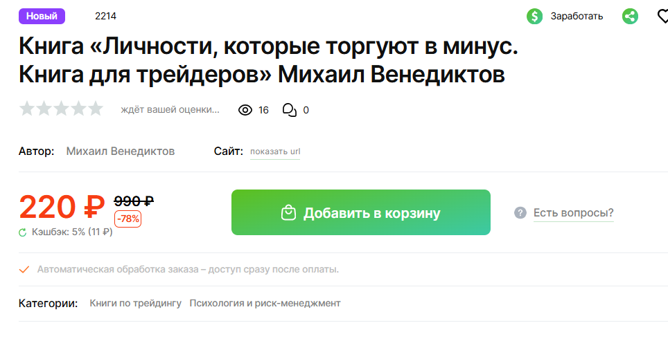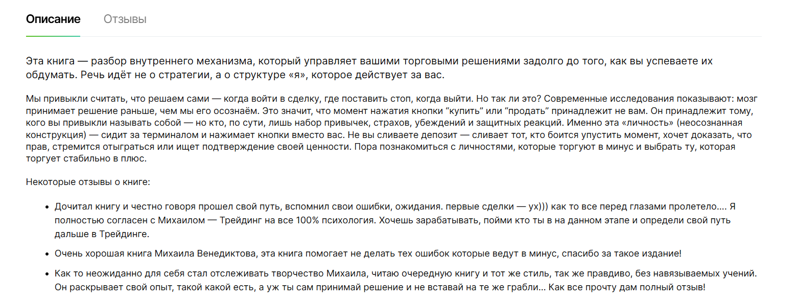 Цена книги Михаила Венедиктова под названием «Личности, которые торгуют в минус. Книга для трейдеров» стартует от 990 ₽. В ней якобы раскрывается, почему 90% трейдеров сливают депозит не из-за стратегии, а из-за «внутренних личностей» и бессознательных решений. Автор обещает помочь познакомиться с личностями, которые торгуют в минус, и выбрать ту, которая торгует в плюс. В обзоре мы разберемся, что стоит за этим продуктом и похожими материалами того же автора.