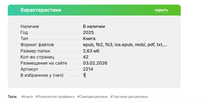 Акцент делается на механизмах принятия решений, эмоциональных паттернах и бессознательных процессах без описания торговых систем или правил управления рисками. Продукт размещен с ценами от 200 до 990 рублей и частыми скидками. Предложения сводятся к автоматической доставке файлов после оплаты без обратной связи.