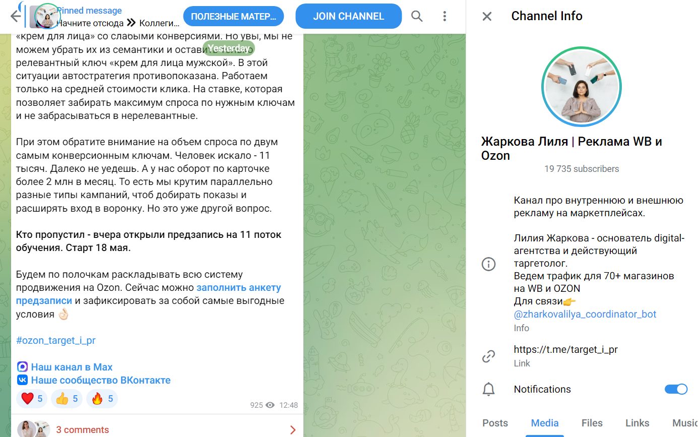 В сообществе админ размещает некоторые обучающие посты по настройке внутренней рекламы на Wildberries и Ozon. Также предоставляет публикации с особенностями продвижения на маркетплейсах, делится результатами работы. В тгк Target i pr предоставляются отзывы о сотрудничестве. Новые публикации появляются практически каждый день.