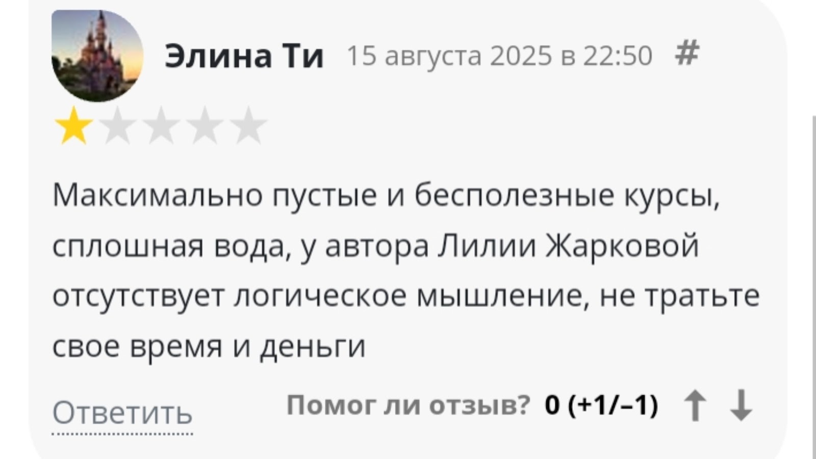 Помимо вышеперечисленного, реальных подтверждений успехов учеников нет. Если вы проходили курсы, которые подвигает Лилия Жаркова, просим поделиться отзывом ниже.