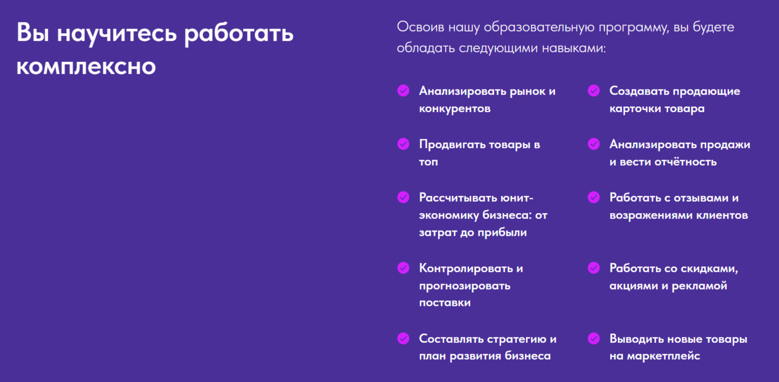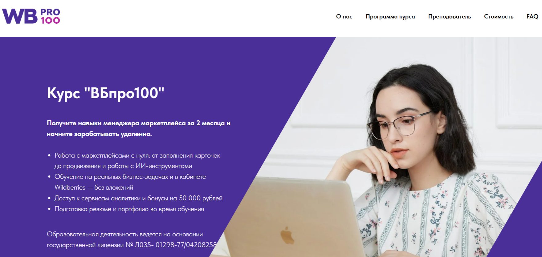 Инструктор Лина Новикова с «Wb про100» предлагает учебный курс, который получится пройти за 2 месяца. Обучаться можно параллельно с работой или другой учебой, поскольку на это не придется тратить много времени. Обучение проходит онлайн. Материалы доступны в любое время. И можно пользоваться мобильной версией платформы. Еще видео предлагаются к просмотру после завершения учебы. Прохождение курса дает право получить диплом. Учебная программа на площадке Wbpro100 Course имеет свои преимущества: