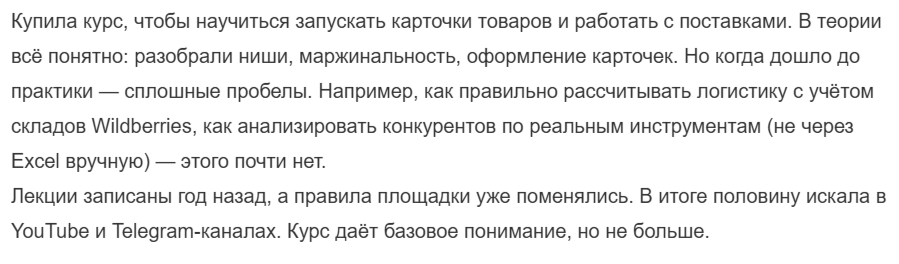 На других площадках размещены противоположные отзывы об обучающем курсе по Валдбериз Лины Новиковой. Пользователи жалуются, что нет экспертных материалов. Лекции устаревшие, поэтому сегодня полученные знания уже потеряли актуальность. Ученики считают курс общим, а не экспертным.