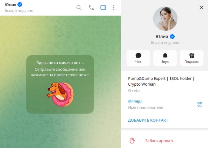 При проверке проекта была доступна только ссылка на личную страницу его создателя. Телеграм-каналом «Финлайн» управляет некая Юлия, которая позиционицерт себя как криптовуман и владелец $SOL. Непонятно, она просто является держателем этих монет или же основателем токена.