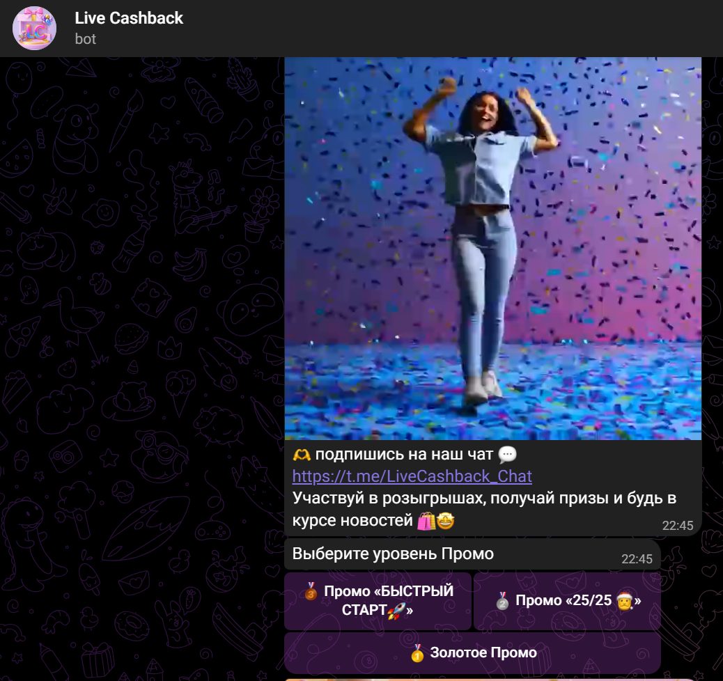 Точной даты запуска Live Cash Back не известно, судя по малому количеству участников в официальном чате и отсутствию упоминаний проекта на сторонних ресурсах, контора стартовала совсем недавно. Основатель — некий Константин Кузьмин, собственного сайта организация не имеет. Это очередной странный момент, как можно сотрудничать с онлайн бизнесом и не завести хотя бы лендинг с контактами и юридической информацией. Из всех ресурсов проект имеет Телеграмм бота, где происходит регистрация участников, и чат для общения.