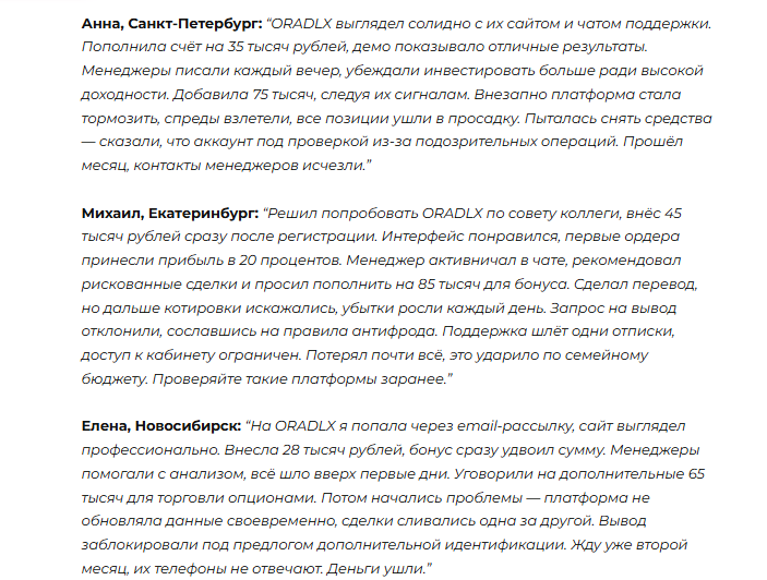 Несмотря на то, что биржа Oradlx Net работает всего несколько недель, отзывы о ней уже начали появляться на различных форумах и сайтах. Пользователи пишут, что после регистрации им начинают активно названивать менеджеры с предложениями пополнить счёт на более крупную сумму, якобы для того чтобы получить лучшие условия.