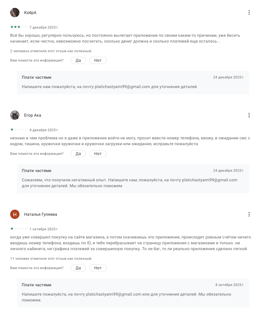 Негативные ревью на сервис тоже имеют. Большинство из них касается не самой рассрочки, а работы приложения.