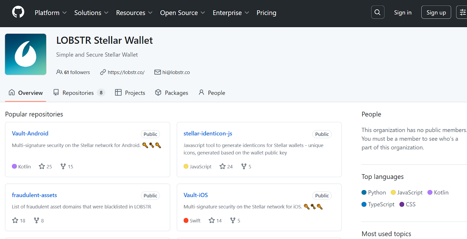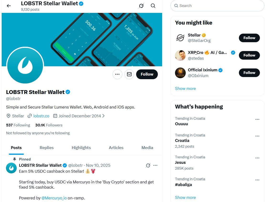 В X аккаунте у проекта Lobstrco 30К подписчиков, аккаунт существует с 2014 г. и публикует новости, статистику по свапам и партнерские акции. Medium-блог насчитывает около 1,3К подписчиков, GitHub-организация — 61 подписчика и 8 публичных репозиториев, связанных с Vault, расширениями и инструментами для Stellar.
