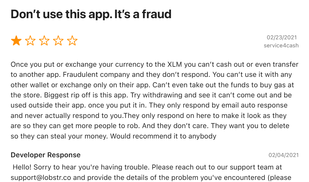 Формально приложение не нарушает своих правил, потому что оно не обещает фиатный вывод и позиционируется как Stellar-кошелек, но разрыв между ожиданиями и реальностью огромный.