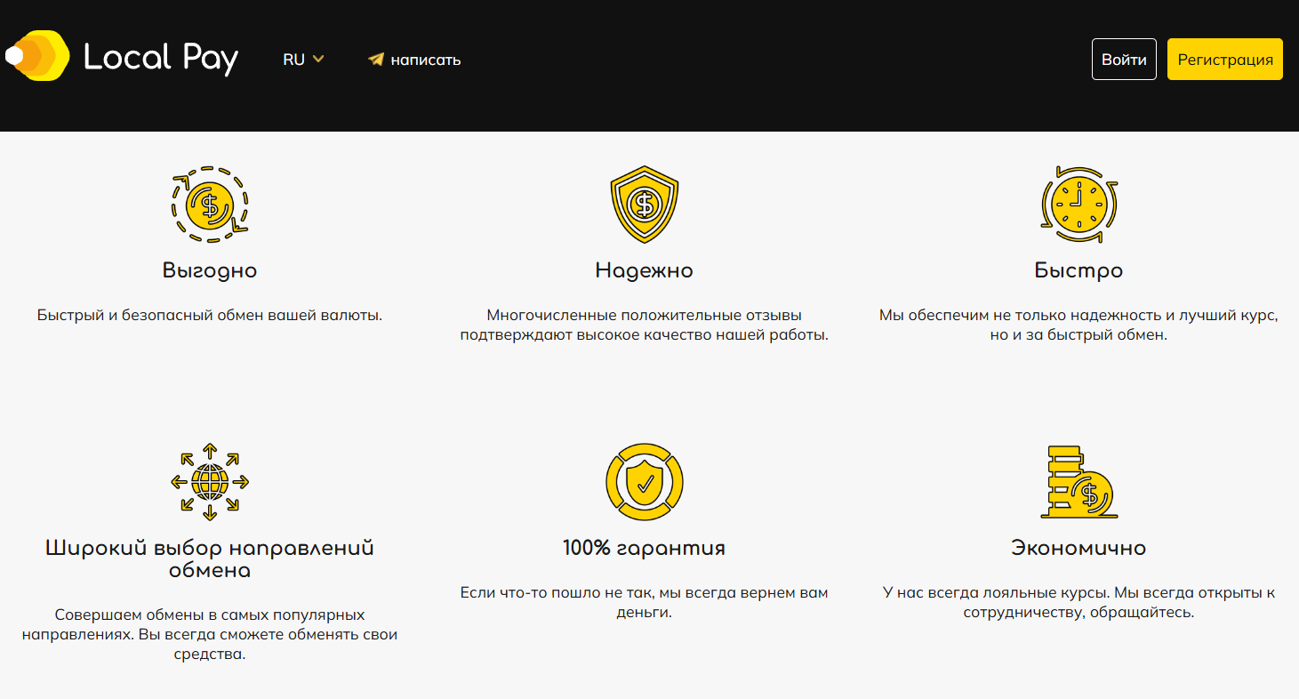 Криптообменник функционирует на сайте Local-pay com, информации о дате основания, истории проекта, ключевых фигурах не представлено. Есть лишь приветственное сообщение и перечисление преимуществ, главные из которых в выгодных условиях, надежности, скорости, гарантии возврата при проблемах. На портале не указана страна происхождения.