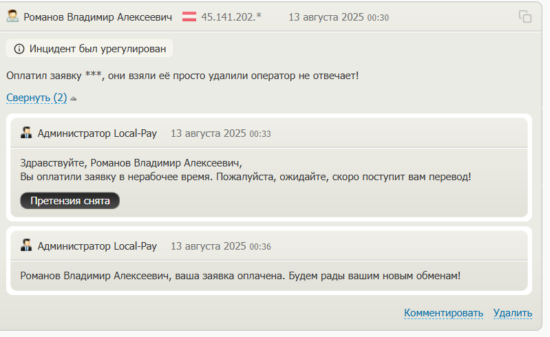 Из отзывов становится понятно, что на Local Pay не стоит создавать заявку на обмен с 00:00 до 07:00, если она должна быть проведена в срочном порядке, так как это нерабочее время.