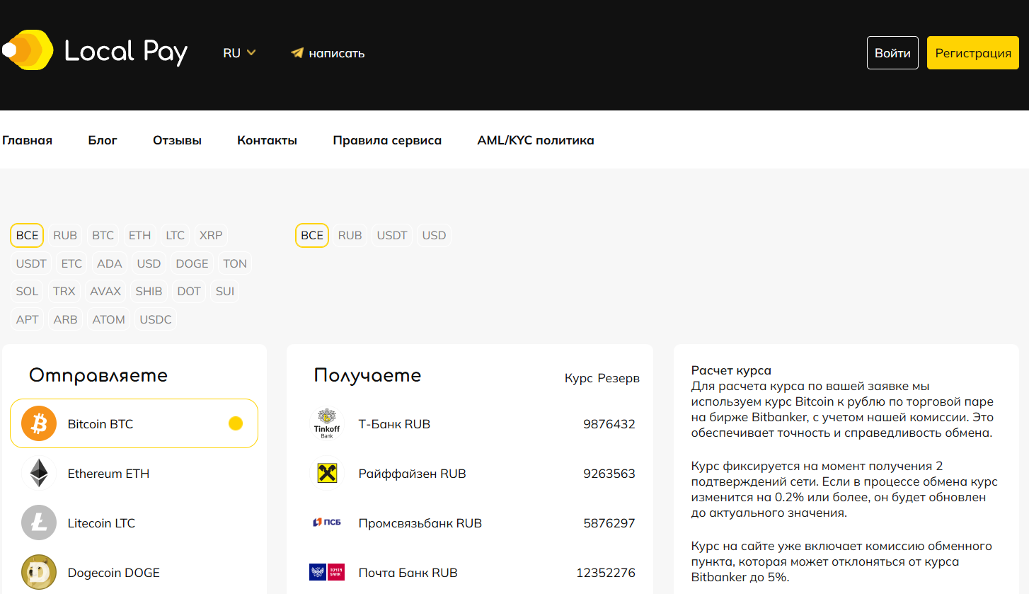 Из крипты доступны BTC, ETH, DOGE, TRX, USDT и многие другие. Фиат в «Локал Пэй» представлен рублями и долларами Обменный пункт работает с рядом российских банков, поддерживает систему СБП, а также наличную выдачу в Москве, Санкт-Петербурге, Екатеринбурге и Ростове-на-Дону.