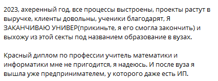 В Интернете минимум информации о наставнике, краткой справкой о себе он делится в личном телеграмм-канале. В 2023 года Лолита получила красный диплом педагога математики и информатики, но по специальности решила не работать. Вместо этого она освоила платформу «Авито» и стала профессионалом своего дела. Никаких подтверждений своих слов девушка не приводит.