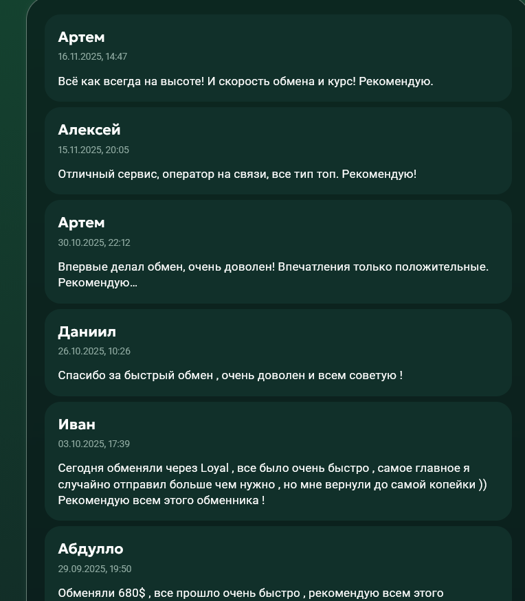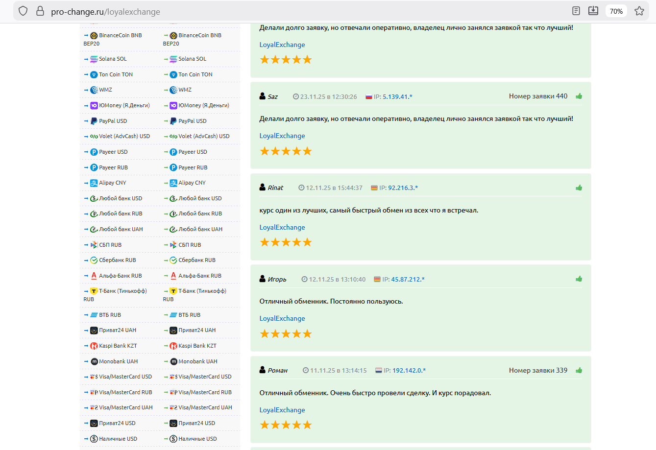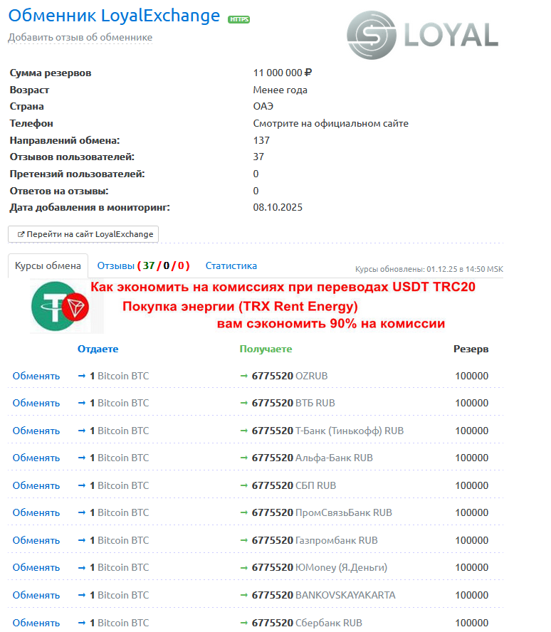 На момент начала декабря 2025 обменник пока не попал под мониторинг bestchange ru, а это всегда тревожный признак. Информация с описанием обменного пункта доступна лишь на сайтах с сомнительной репутацией вроде pro-change ru, KursExpert, okchanger ru и e-mon cc. По имеющимся там сведениям, офис Loyal Exchange расположен в ОАЭ, сумма резервов составляет ₽11,000,000 и к услугам пользователей представлено 137 направлений обмена.