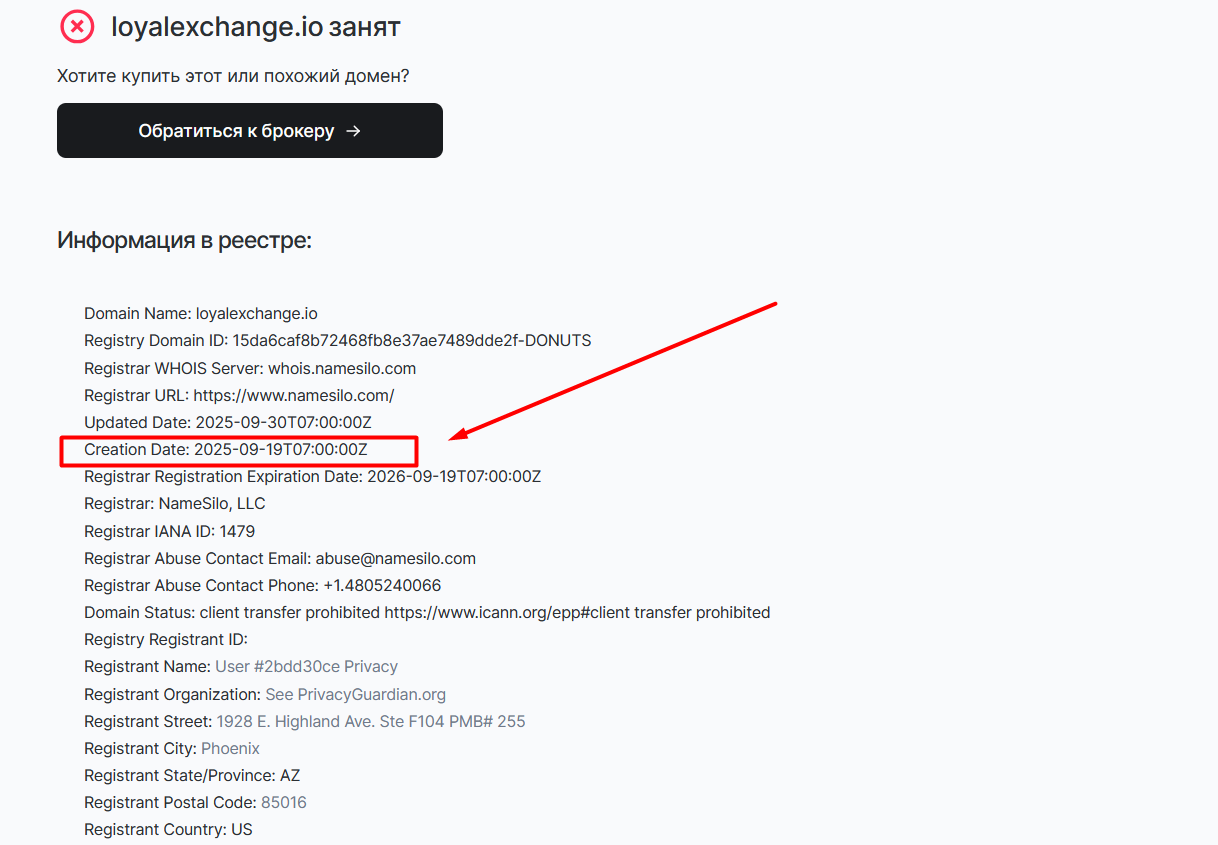 Свою деятельность по обмену цифровых и фиатных валют онлайн-сервис Loyal Exchange начал в октябре 2025. Эта информация подтверждается результатами проверки домена, указывающими на то, что доменное имя зарегистрировали только 19 сентября 2025.