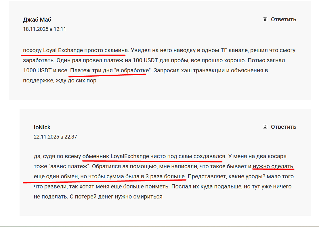 5. Негативные сообщения уже появляются и их количество начинает расти. Пользователи жалуются, что деньги на LoyalExchange io неправомерно присваивают себе, но на этом не останавливаются. Понимая, что человек в уязвимом положении, на него давят, чтобы выжать побольше.