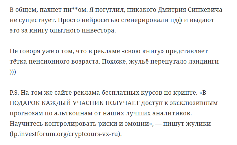 Шаблонные фразы о финансовой независимости и свободе уже стали визитной карточкой аферистов. Выдуманный персонаж Дмитрий Синкевич раскручивается авторами сомнительной площадки без подтверждения уровня знаний и каких-либо откликов о предлагаемой книге. За хитросплетенным разводом и путаницей с авторами скрывается единственная цель – выведать у потенциальной жертвы обмана личные данные.