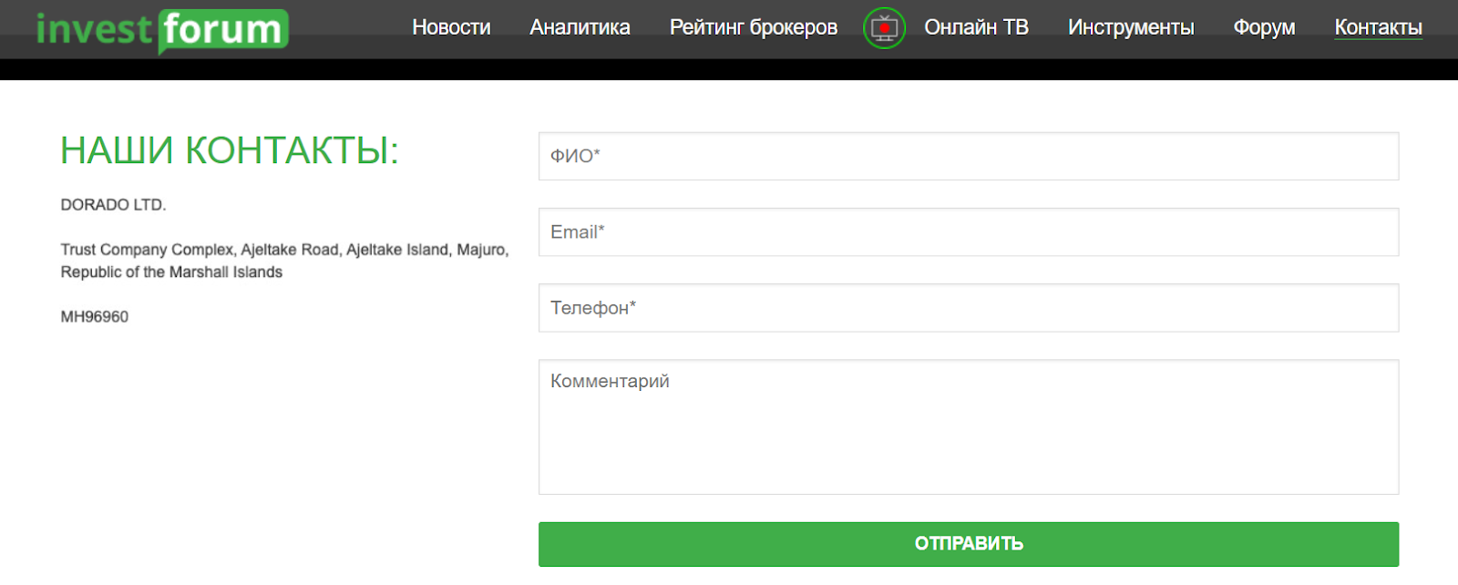 Номеров телефонов или аккаунта техподдержки в соцсетях у Ip investforum org нет. В разделе Контакты представлен тот же фейковый адрес, за которым тянутся названия самых различных компаний, а также форма для обратной связи.