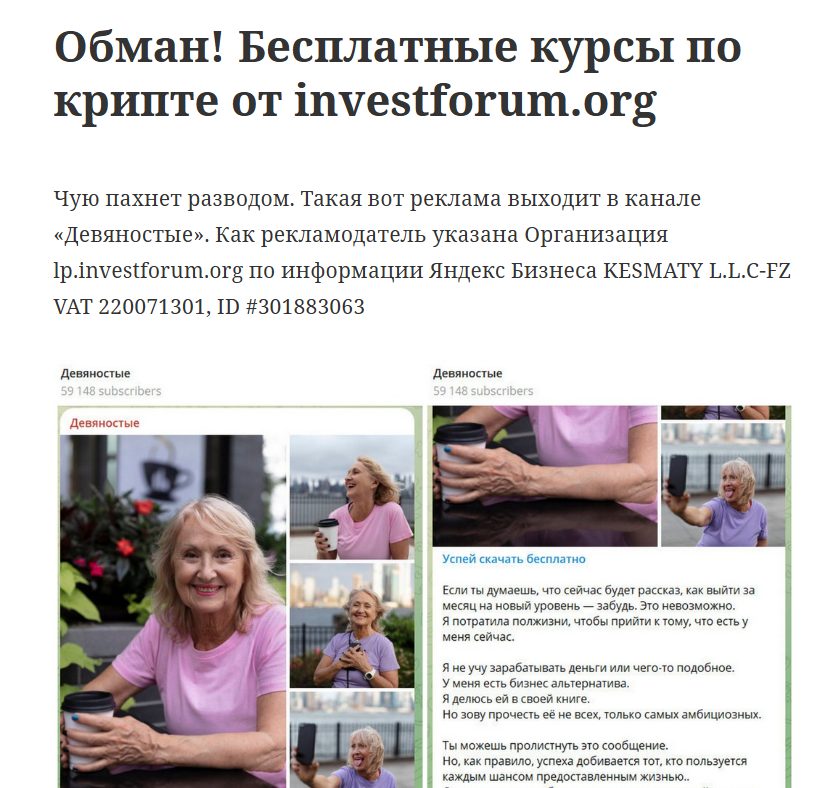 Юзер сообщает, что реклама проекта Лп инвестфорум публикуется на канале “Девяностые”, а основатели перепутали автора издания. Книга здесь продвигается от имени активной пожилой женщины.