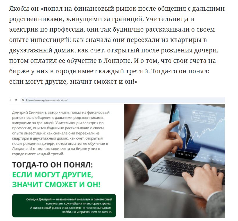Основное предложение инвестора Дмитрия Синкевича – до 10 ежедневных прогнозов, точность которых якобы превышает порог 80%. По легенде Дмитрий является автором книги. Для доступа к материалам, которые направят клиентов на путь “достойный лучшей жизни”, пользователь должен оставить свои личные данные.