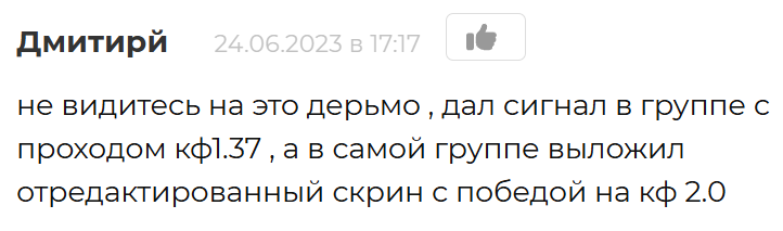 Один из фолловеров сообщает, что «Даня» предоставил ему сигнал, который отличался от того, что он выложил в своей группе. Мошенник редактировал свои прогнозы «задним числом», когда уже был известен результат.