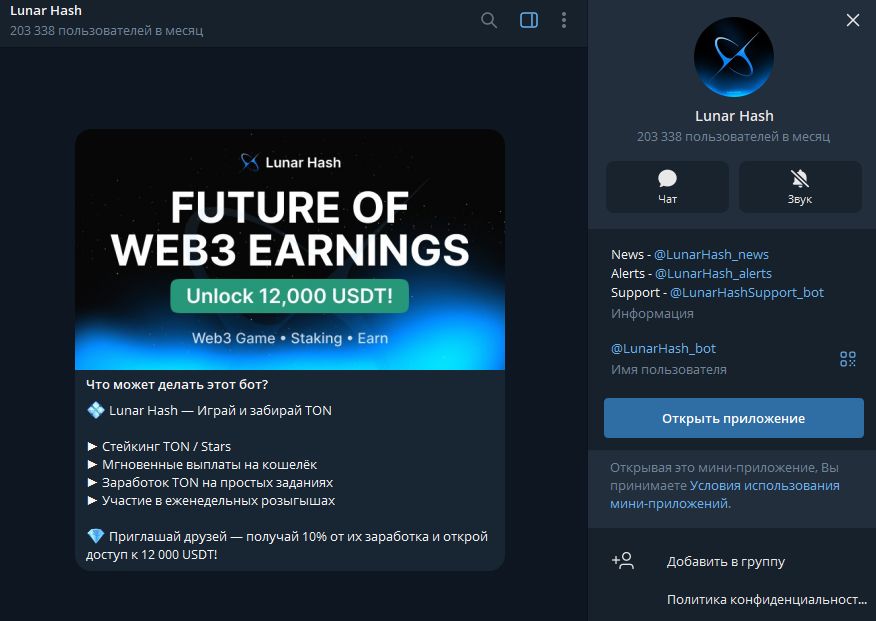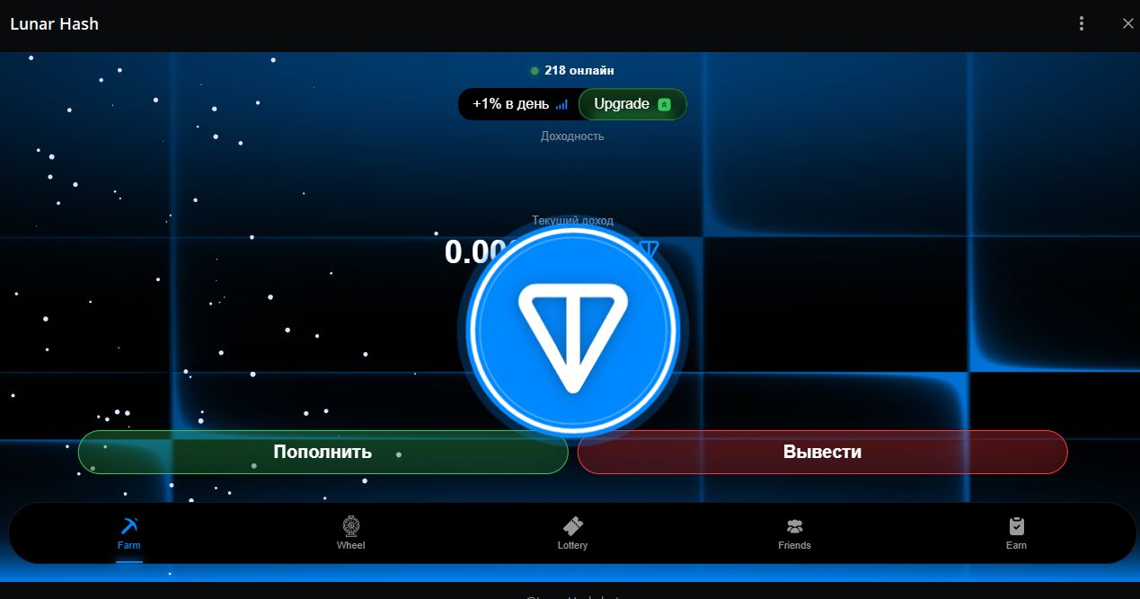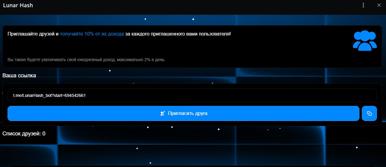 Lunar Hash – это мини-игра в Телеграме, позволяющая получать пассивный доход на крипторынке. Режим работы приложения полуавтоматический. Играя в Lunar Hash пользователи инвестируют в TON или звезды Телеграма, после чего средства поступают в оборот алгоритмической торговли. Таким образом генерируется ежедневный заработок до 2%.