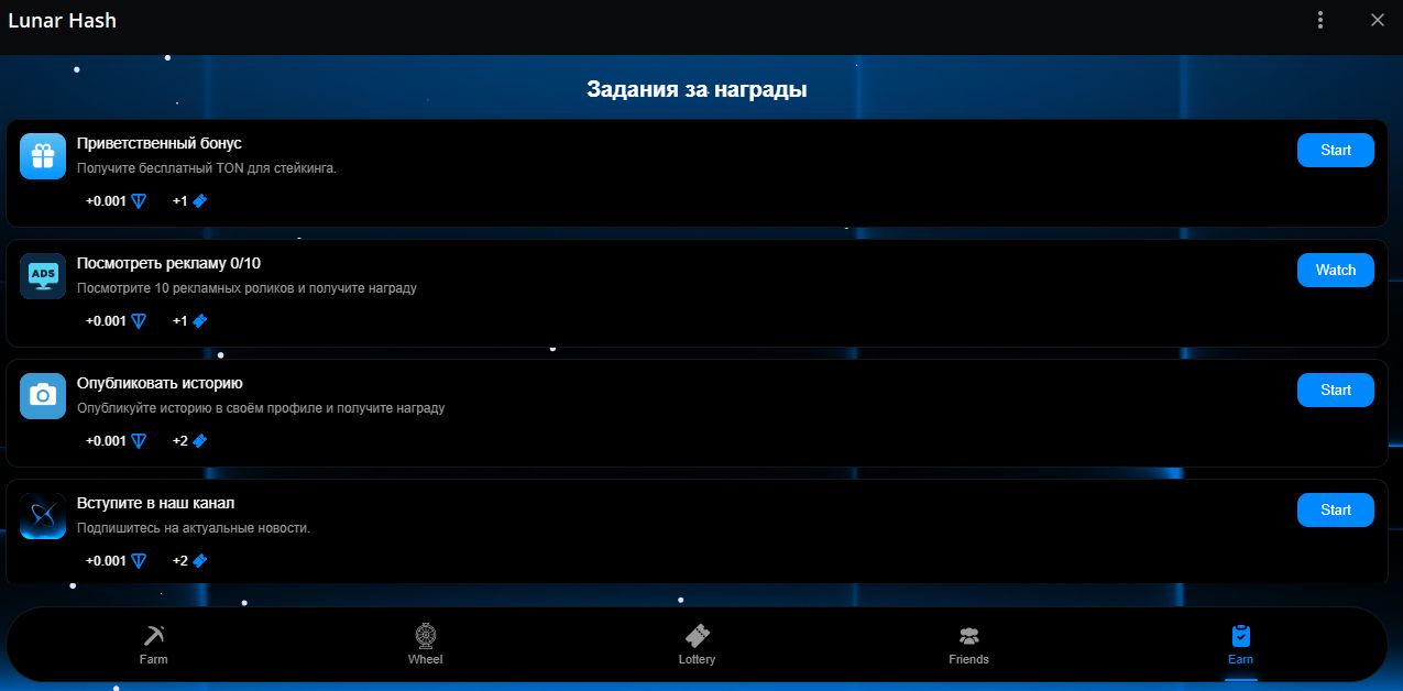 Заданий, к слову, довольно мало. Например, за просмотр 10 рекламных роликов или за выпуск сторис заплатят 0,001 TON, а это около 15 копеек. Токены вывести нельзя – это игровая валюта Lunar Hash.