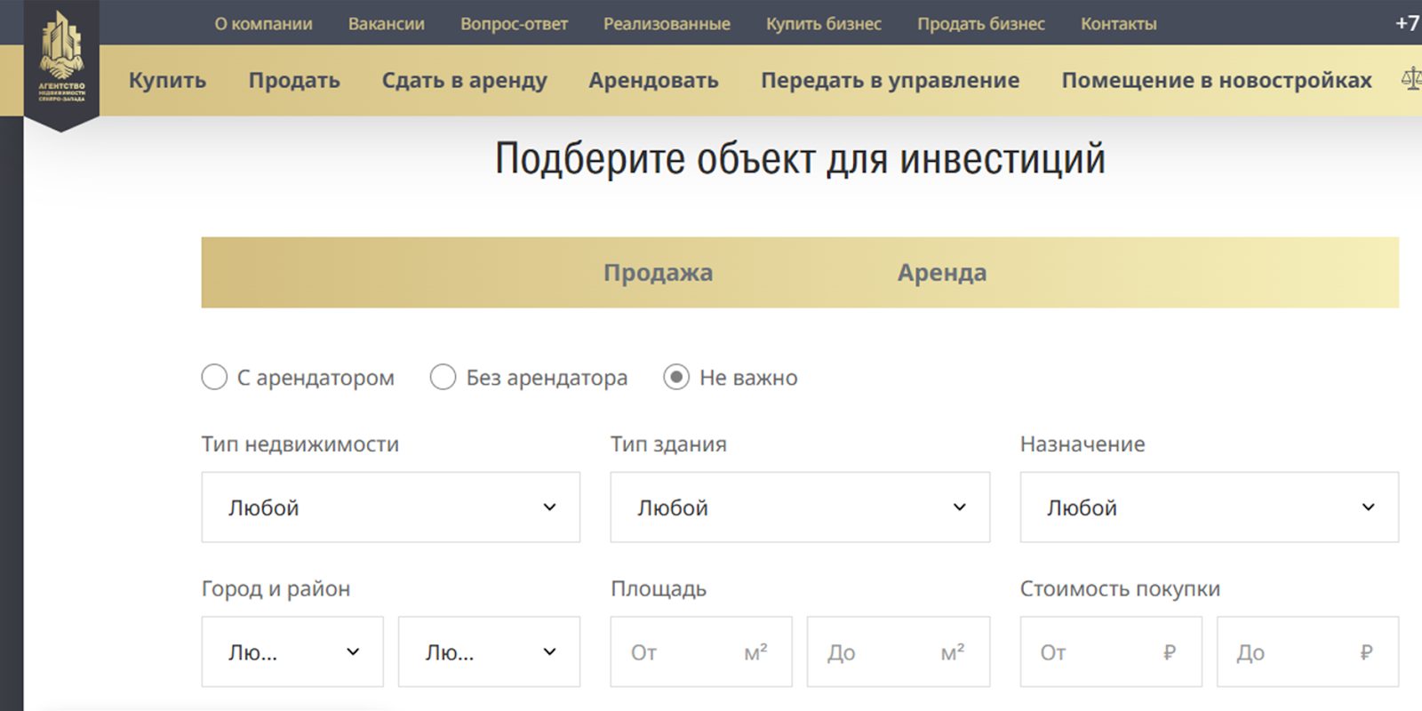 Для удобства потенциальных клиентов предусмотрен фильтр для предварительного подбора объектов. Для получения списка доступных помещений нужно ввести назначение объекта, тип недвижимости, площадь, район, предполагаемый диапазон стоимости.
