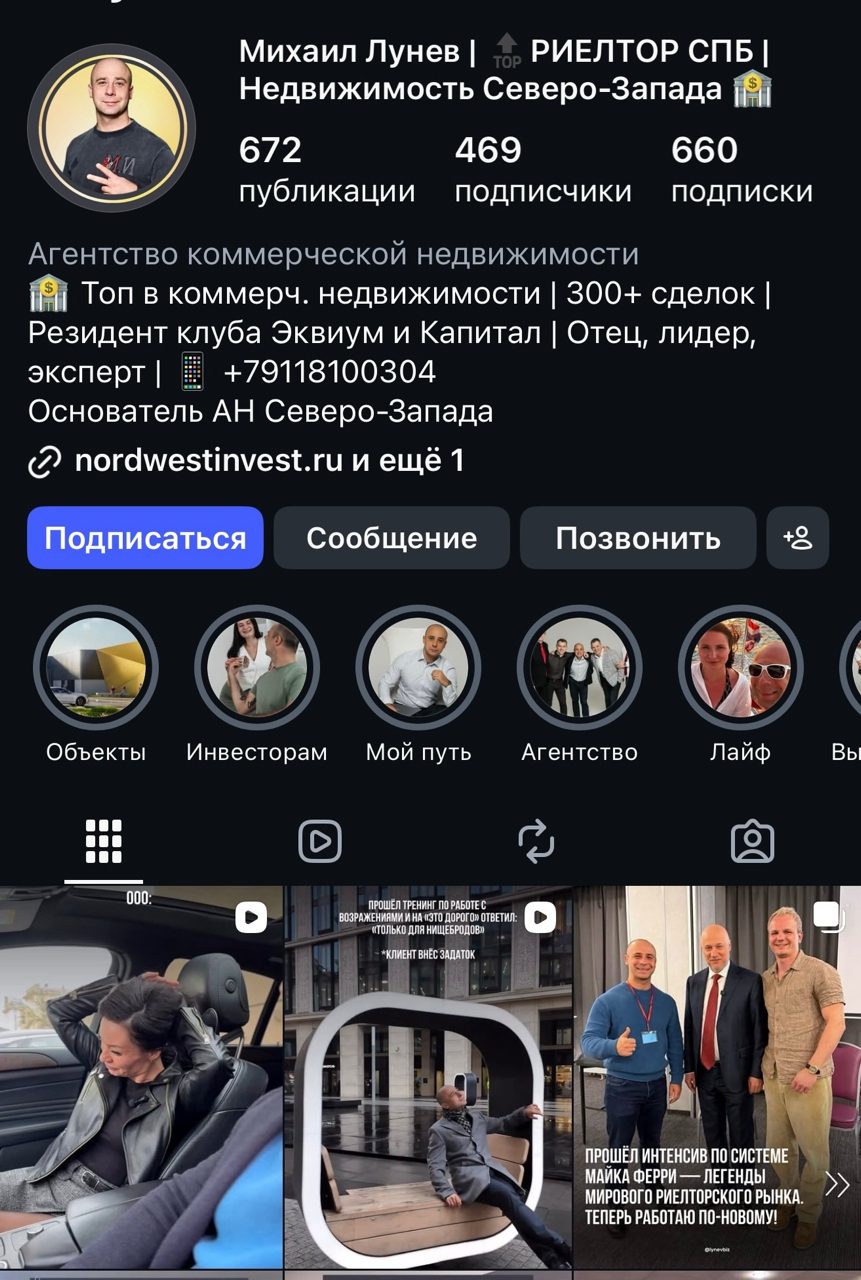 Как и личный аккаунт Михаила, так и рабочий аккаунт агентства ведется крайне профессионально. Контент представляет собой синтез полезной информации с юмористическими видео по теме инвестиций в коммерческую недвижимость и ее аренды.