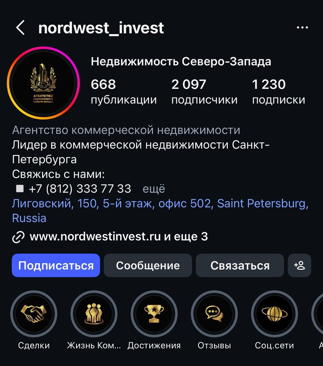 Также, в Инстаграме создан отдельный профессиональный аккаунт агентства Лунева – @nordwest_invest. На него подписано порядка 2000 пользователей.