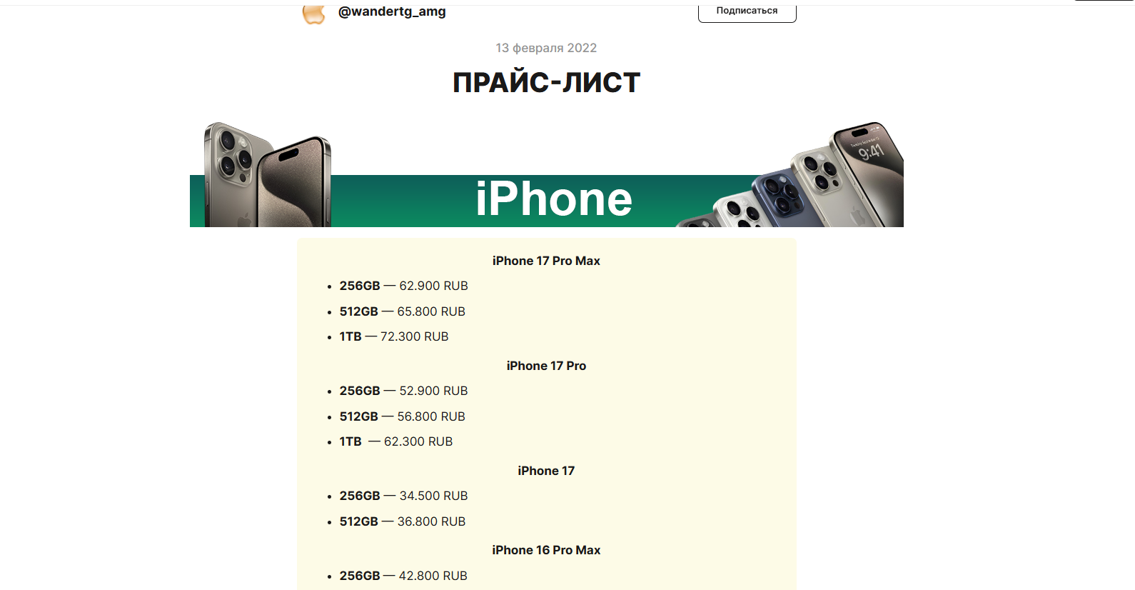• iPhone 17 PRO — на 256 GB 52 900 руб., на 512 GB 56 800 руб., на 1 TB 62 300 руб.;