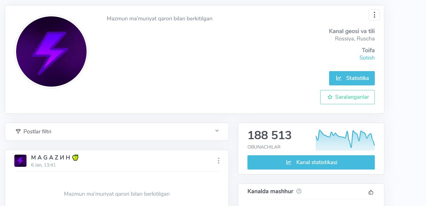 Ранее у магазина были разные Телеграмм каналы, включая MAGAZiN ОРИГИНАЛЬНОЙ ТЕХНИКИ, M a g a z и н. Однако сейчас не функционирует ни один из них. Исходя из информации на тгстат, ранее у самого популярного паблика было 188.5 тыс. подписчиков. Посты набирали 4-6 тыс. просмотров, что говорит об очевидной накрутке.
