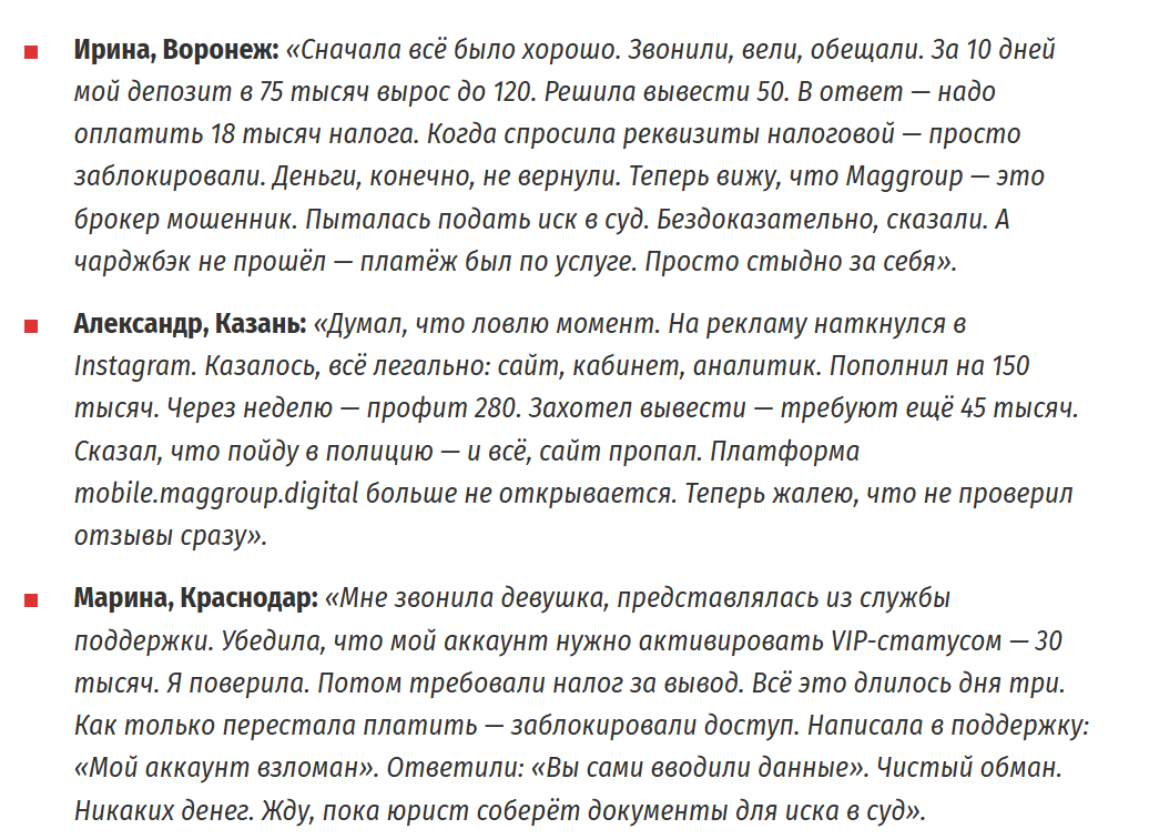 В интернете отсутствуют отзывы о проекте Maggroup digital. Платформа существует относительно недолго и не накопила значительного количества комментариев. Вместо этого начали появляться статьи, где авторы предупреждают о рисках. Недавняя регистрация домена без долгой истории существования вызывает сомнения.