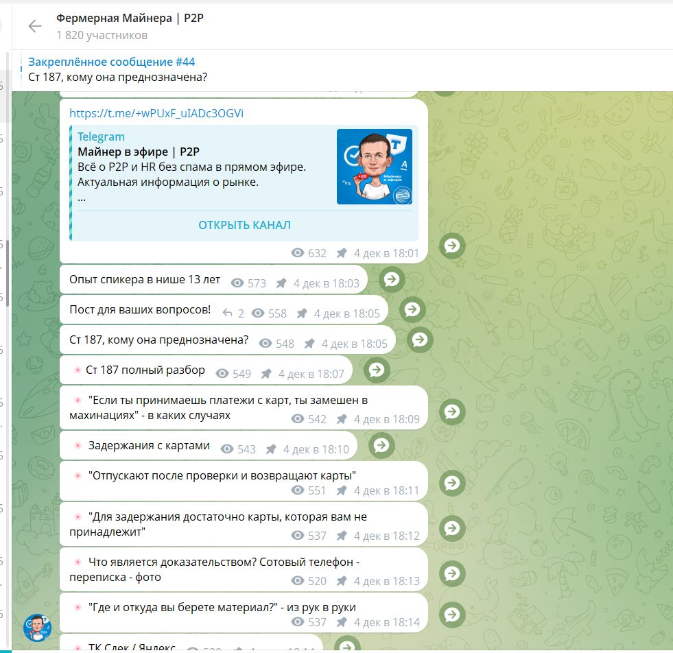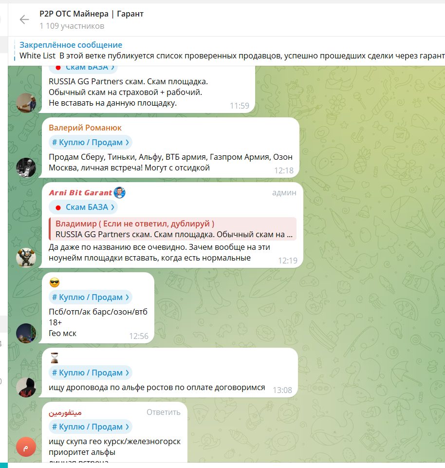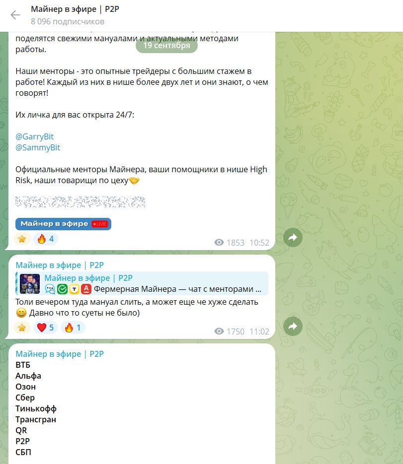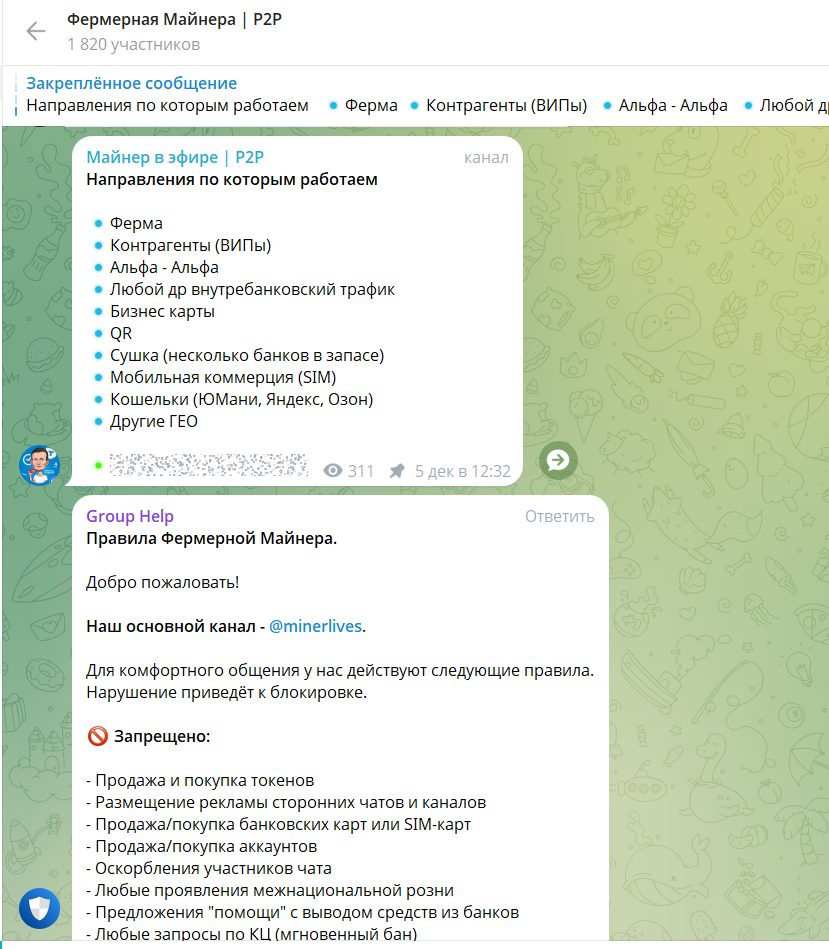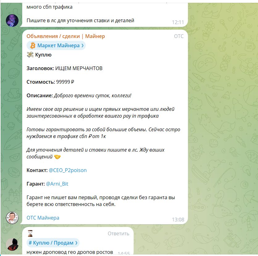 В чатах miner p2p постоянно мелькают объявления о поиске дроповодов, продаже карт, торговле методами, F2F-встречах с наличными, что само по себе показывает высокий риск нишевой серой деятельности.