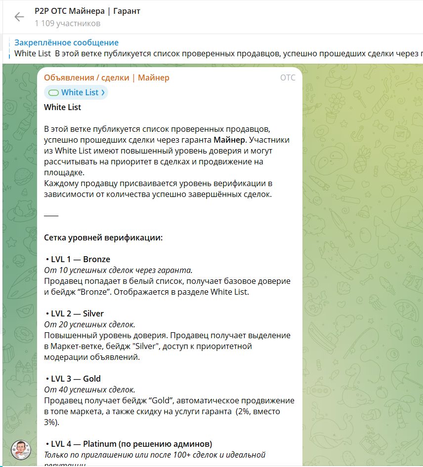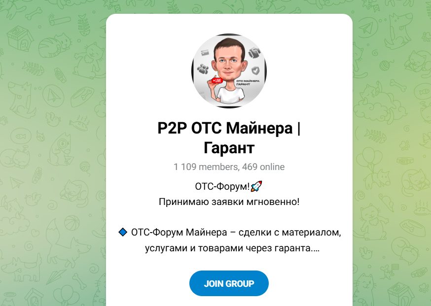 • “P2P ОТС Майнера Гарант” (1 109 участников), где проходят сделки по материалам и услуге через гаранта.