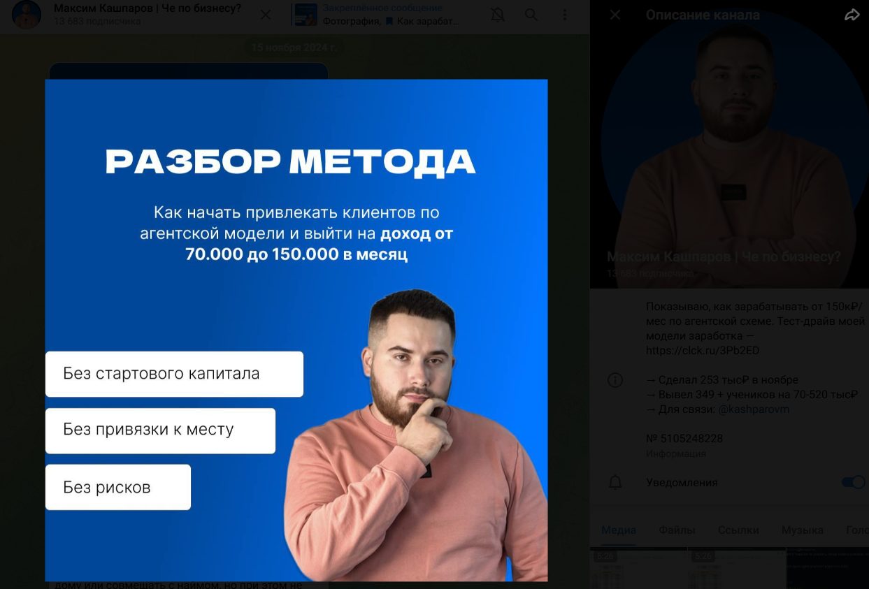 В телеграм Максим Кашпаров делится своей историей, где раньше он работал в найме и не понимал зачем стараться ради чужих успехов, а затем якобы превозмог себя и начал зарабатывать на агентской схеме через авито. Он заявляет, что имеет огромный опыт и знает все тонкости работы, однако многие инфоцыгане приукрашают свои слова, чтобы привлечь наивных читателей. На это наводят мысли посты и ответы подписчикам, где Макс оперирует исключительно общими словами без конкретики. Что касается связи, то в тг он записан как Kashparovm.