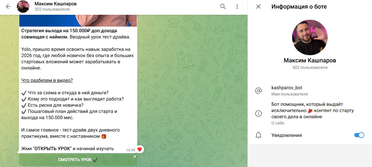 Для прогрева аудитории он предлагает посетить отдельного бота, Kashparov bot, где отправляет ссылку на демо версию урока, однако там абсолютно нет ценной информации. Фактически Максим просто хвастается своими достижениями, рассказывает о якобы реальных кейсах, а также высоком спросе в этой нише. Однако реальной, пошаговой как он обещает инструкции нет. В конце он призывает перейти в платный интенсив и прикрепляет видео отзывы довольных клиентов, что больше напоминает действия инфоцыгана.