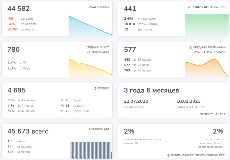 Статистика канала выглядит очень неестественно. При аудитории в 44 тыс. подписчиков посты едва ли набирают 700–800 просмотров. Выходит менее 2% вовлеченности (ERR), что для живого коммерческого канала — абсурд. Обычно в популярных магазинах этот показатель держится на уровне 10–20%. Такая диспропорция говорит лишь об одном: основная масса подписчиков — «мертвые души» и накрученные боты. Иллюзия популярности создана искусственно, чтобы у случайного посетителя возникло ложное ощущение надежности и востребованности паблика.