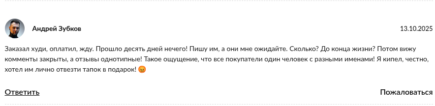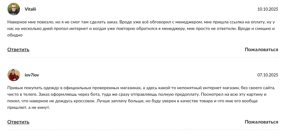Люди жалуются, что после перевода средств менеджер перестает выходить на связь. Никаких трек-номеров или посылок никто не получает. Мало того, админы регулярно меняют ссылки на проект и ники менеджеров, чтобы замести следы аферы. Общий фон мнений сугубо негативный: магазин называют лохотроном для тех, кто верит в сказки про брендовые кроссовки по цене обеда в фастфуде. Ни одного подтвержденного случая успешной покупки вы не найдете.