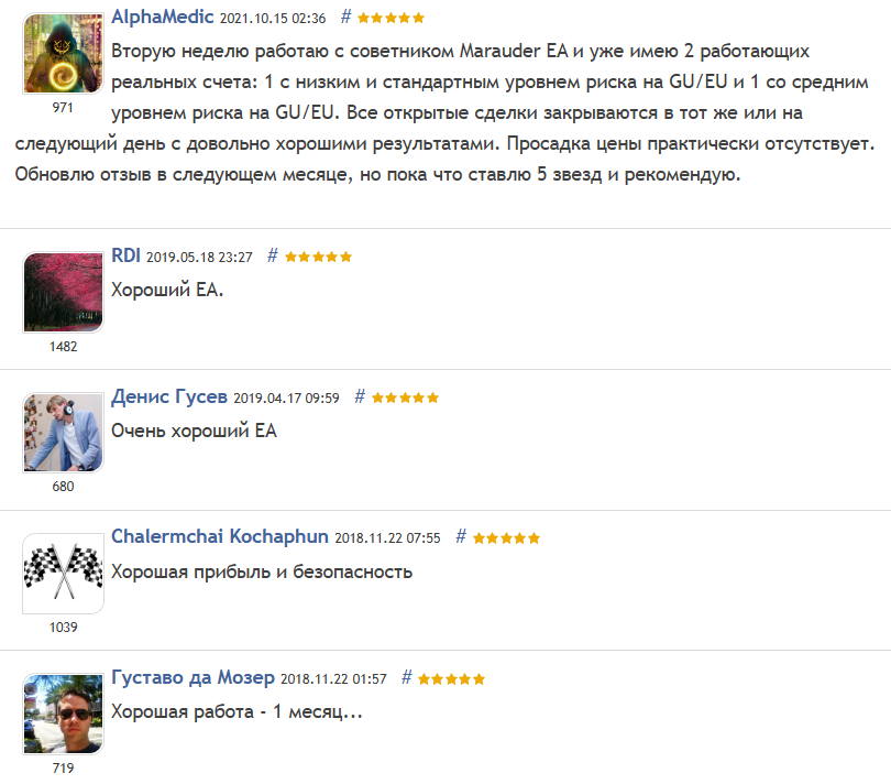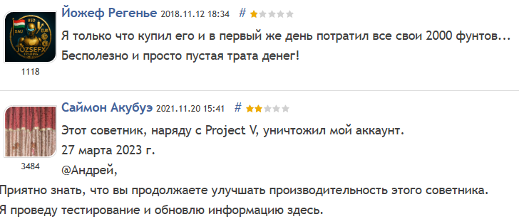 Часть пользователей делилась успешным опытом. Один трейдер тестировал робота две недели на реальных счетах. Использовал разный уровень риска. Сделки закрывались в тот же день или на следующий с плюсом. Просадки были минимальные. Другие покупатели оставляли короткие положительные комментарии. Называли советника хорошим. Детали торговли и цифры не раскрывали.