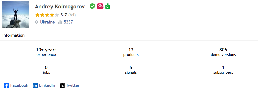 Об Андрее Колмогорове ничего не известно. Про опыт ничего не сказано. Автор продал более 500 программ на маркетплейсе. Его рейтинг продавца – 3,7 балла из 5. Это средний показатель с учетом всех его продуктов.