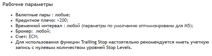 Робот торгует любыми валютными парами. Таймфрейм по умолчанию – М5. Можно настроить под другие периоды. Поддерживает 4-значные и 5-значные котировки. Работает только на ECN-счетах.