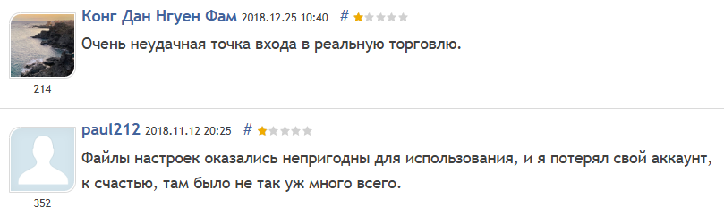 Трейдеры жаловались на неудачные точки входа. Готовые файлы настроек не оправдали ожиданий. Приводили к убыткам. Один комментарий указывал на плохую стратегию выхода. Робот приносил прибыль какое-то время. Потом следовал крупный убыток, который перекрывал весь заработок.
