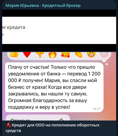 На канале периодически появляются скриншоты благодарностей от клиентов. Формулировки типичные. Получил одобрение после нескольких отказов. Помогли решить проблему с плохой кредитной историей. Все отклики положительные.